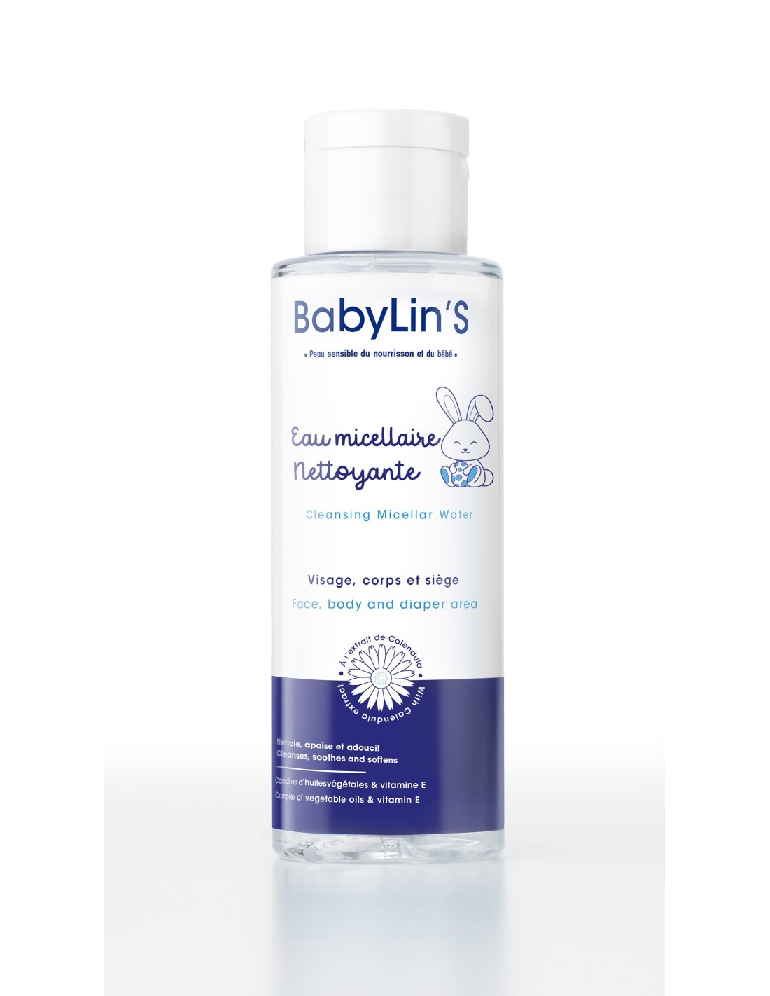 L'Eau Micellaire Nettoyante BabyLin'S nettoie en douceur le visage, le corps et le siège de bébé.Spécialement formulée pour éliminer efficacement les impuretés, cette eau micellaire respecte l'équilibre naturel de la peau tout en préservant sa douceur et son hydratation.Grâce aux propriétés apaisantes de l'extrait de fleur de calendula , elle calme et adoucit l'épiderme sensible du nourrisson, offrant un nettoyage doux et respectueux à chaque utilisation. Idéale pour les peaux délicates, BabyLin'S Eau Micellaire Nettoyante assure une sensation de fraîcheur et de confort à votre bébé, sans irriter ni dessécher sa peau.